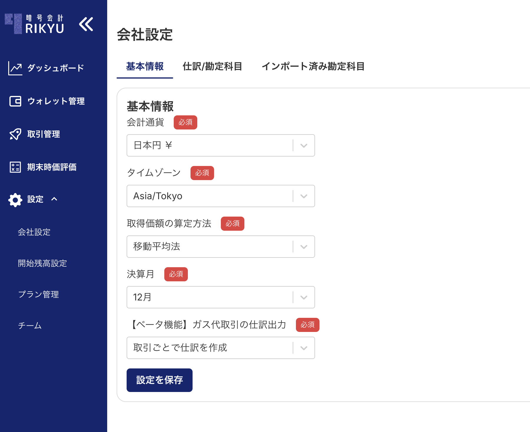 RIKYUの会社設定画面の基本情報タブでは、損益計算や仕訳出力に直接影響する重要な会計設定を行います。これらの設定は、RIKYUで正確な暗号資産会計を行うための基盤となるため、初回設定時に正しく設定することが重要です。
