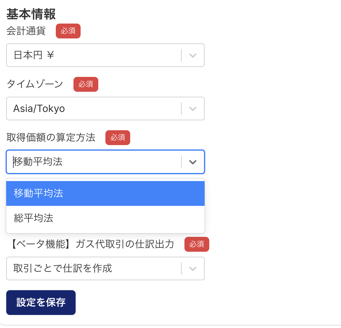 暗号資産の平均取得価額を算出する方法を選択します。これは損益計算に最も大きく影響する重要な設定です。損益計算の方法を変更する場合は当局に届出を提出する必要があります。