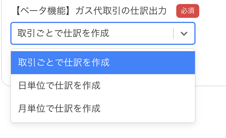 - 取引単位で仕訳を作成: 取引ごとにガス代の仕訳を個別作成(デフォルト)