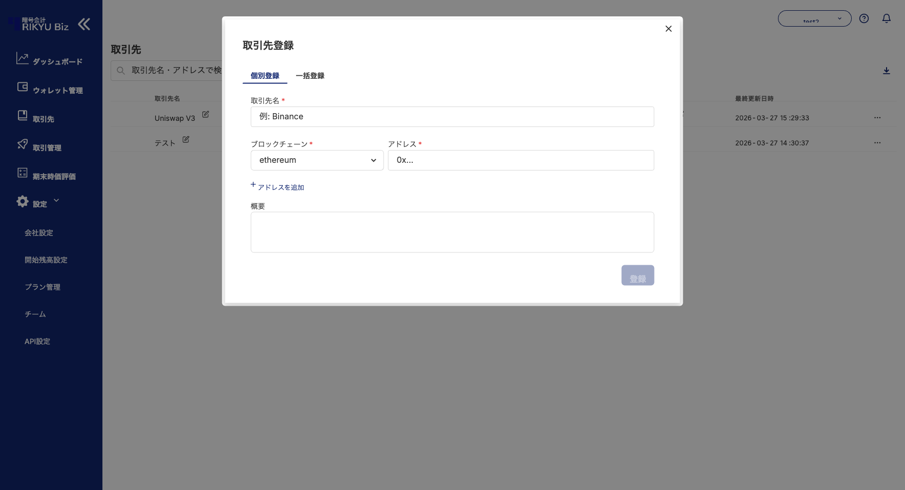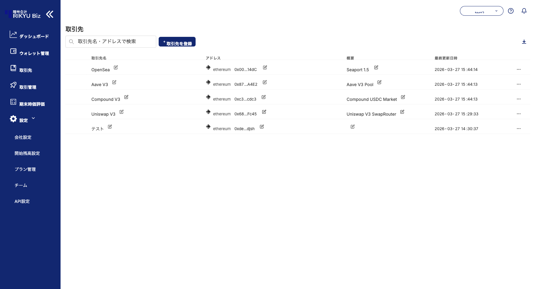 A: RIKYUは主要なDeFiプロトコルや取引所のアドレスを自動認識して名称を表示します。取引先機能は、自動認識されない独自のアドレス(取引相手の企業ウォレットなど)に名前を付けるために使用します。