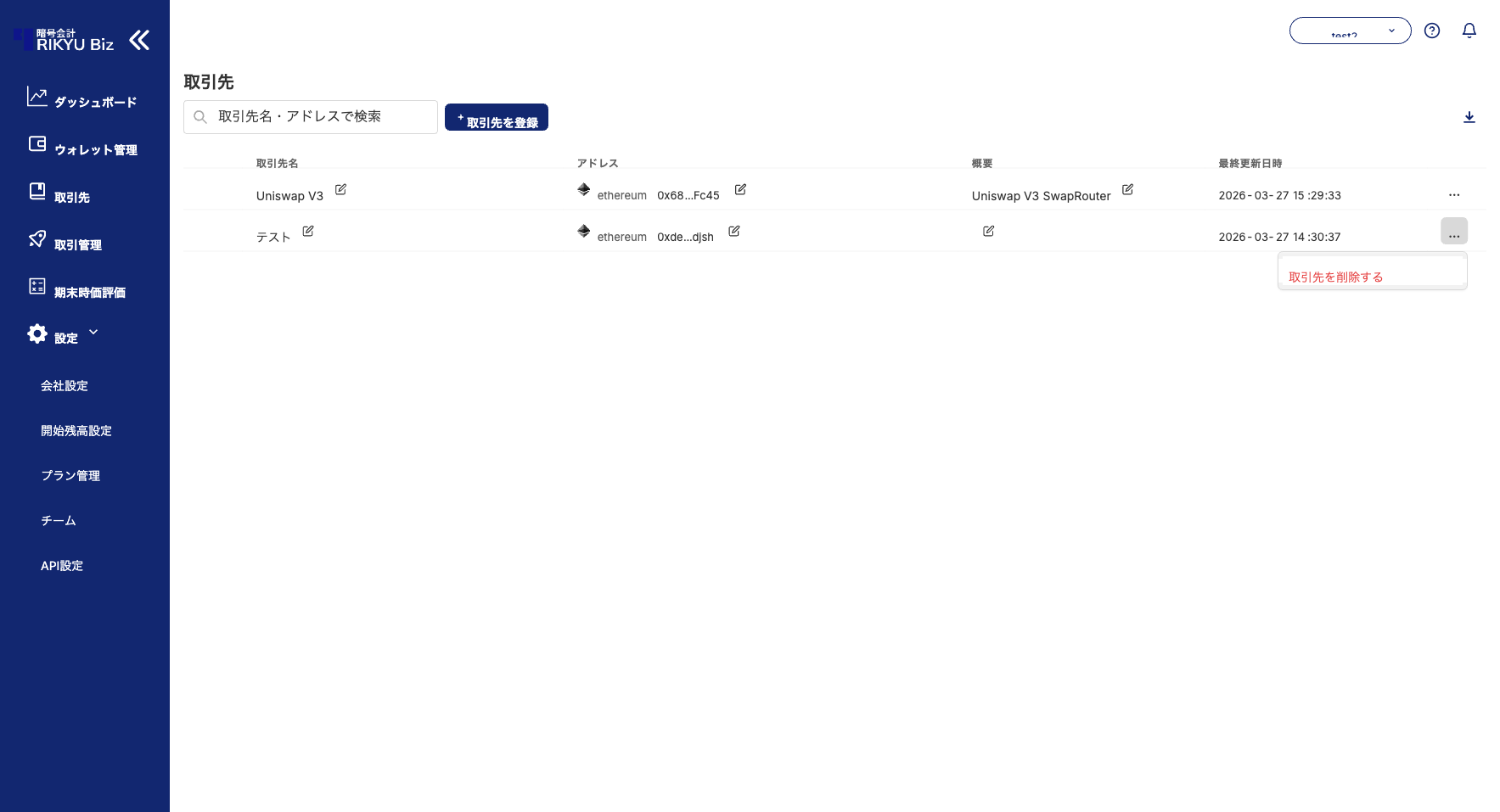 取引先機能を使うと、相手方のウォレットアドレスに名前を付けて管理できます。登録すると取引管理画面でアドレスの代わりに取引先名が表示され、取引の確認・分類がスムーズになります。チームメンバー全員で共有されます。