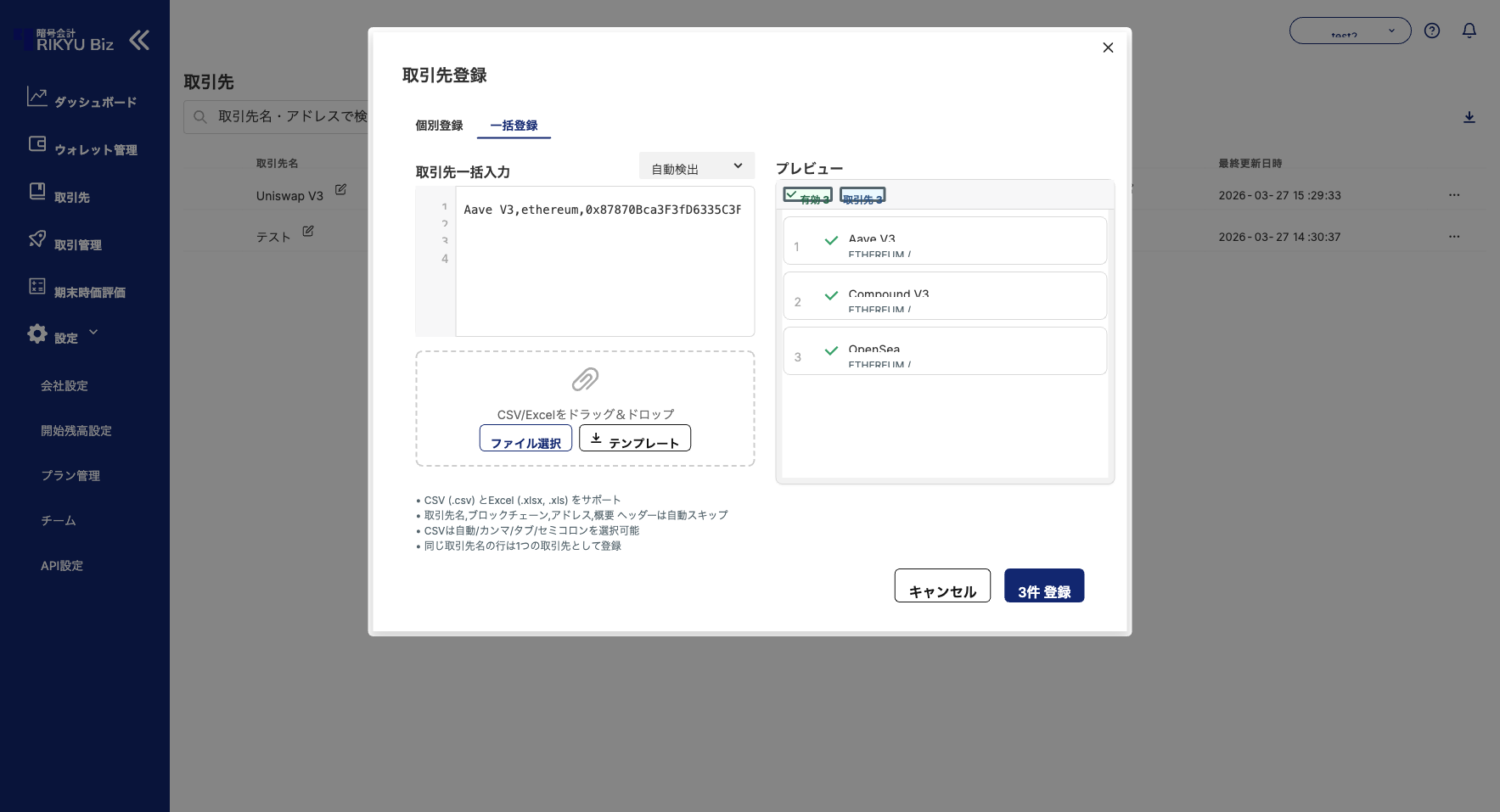 取引先名、ブロックチェーン、アドレス、概要をカンマ・タブ・セミコロンのいずれかで区切って入力します。ExcelやGoogleスプレッドシートのセルをそのまま貼り付けることもできます。