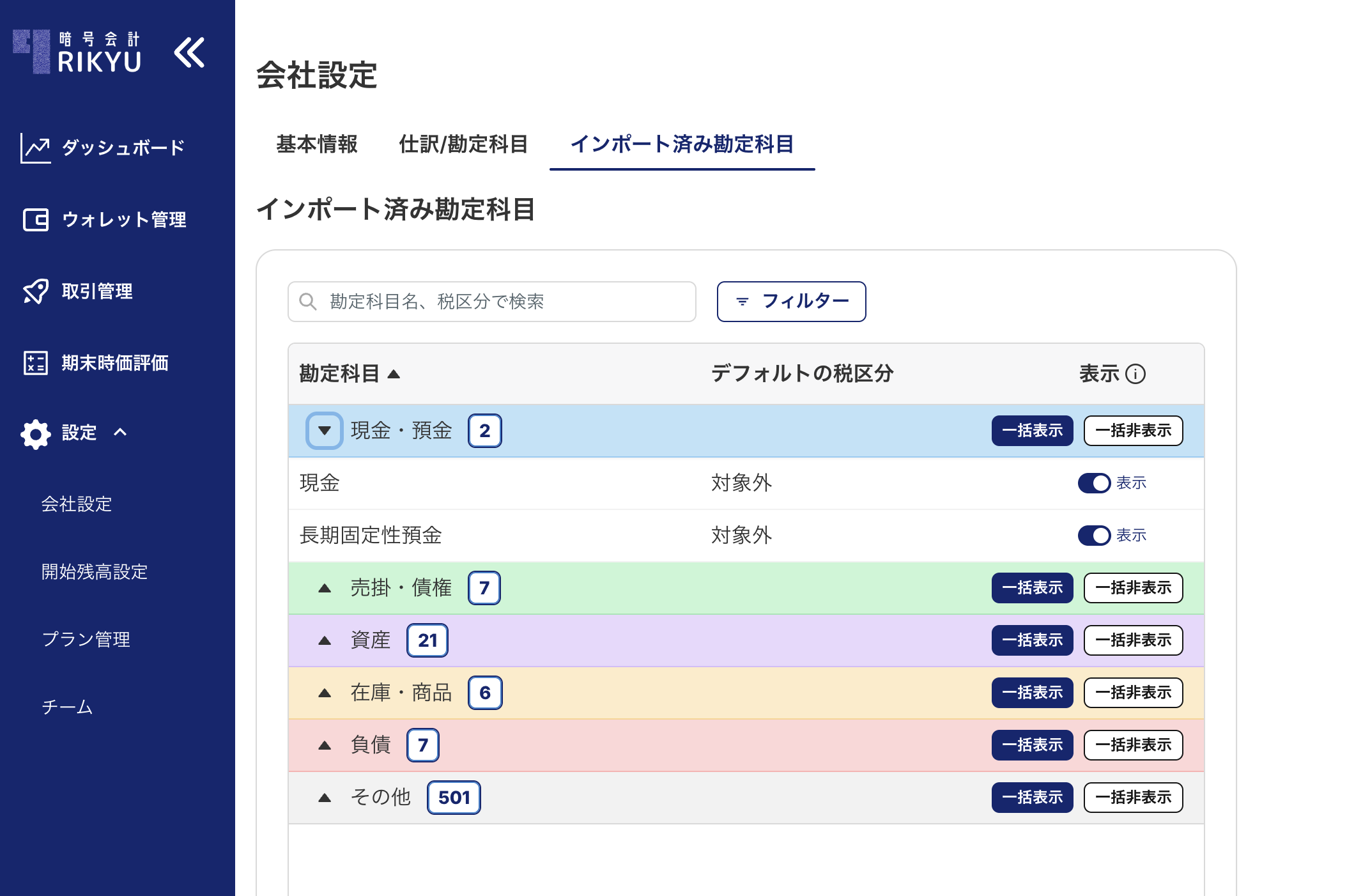 RIKYUにはご利用の会計システムの全ての勘定科目がインポートされます。暗号資産会計では特定の勘定科目のみ利用します。
