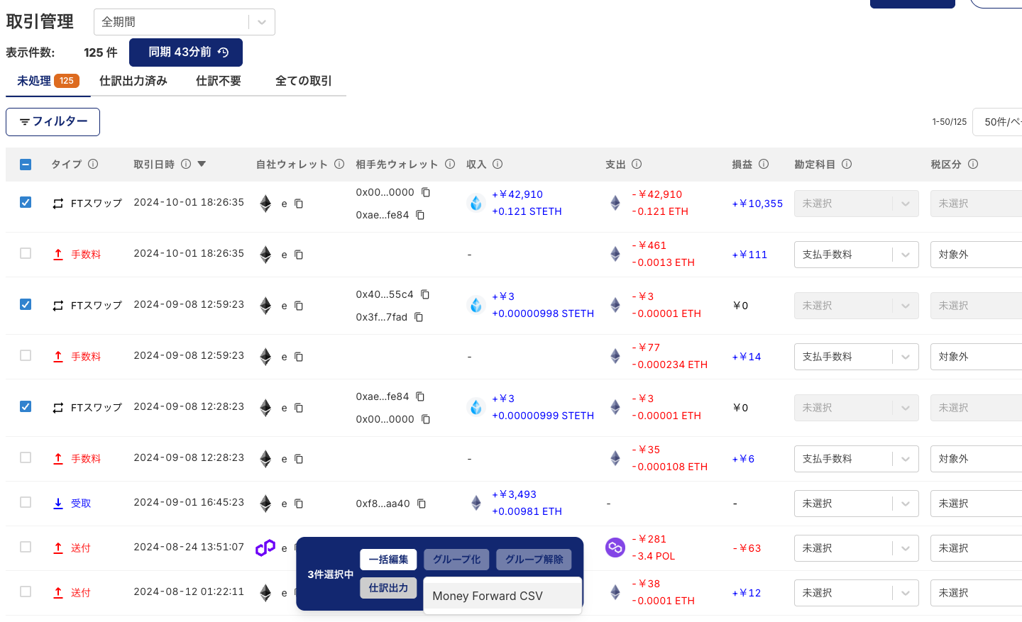取引管理画面を開き、未処理タブに表示されている取引に対して、取引勘定科目を付与してください。
