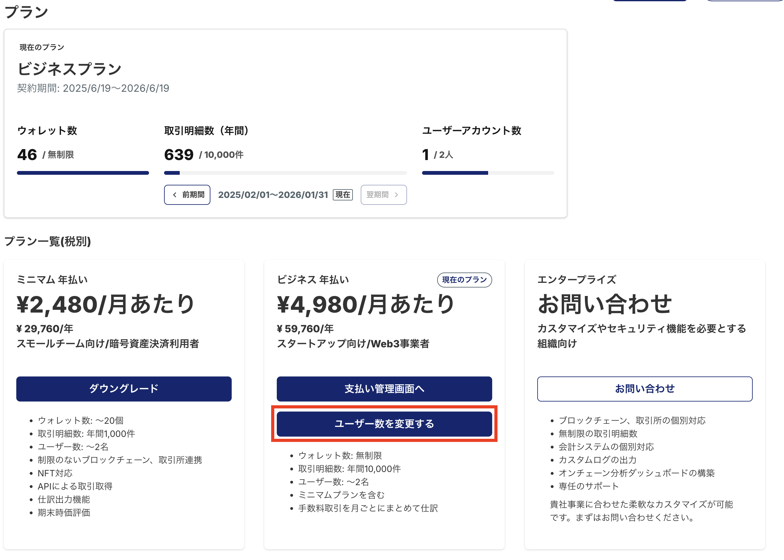 サイドメニューからプラン管理を選択してください。 - 現在のプランカードに表示されているユーザー数を変更するボタンをクリックします。