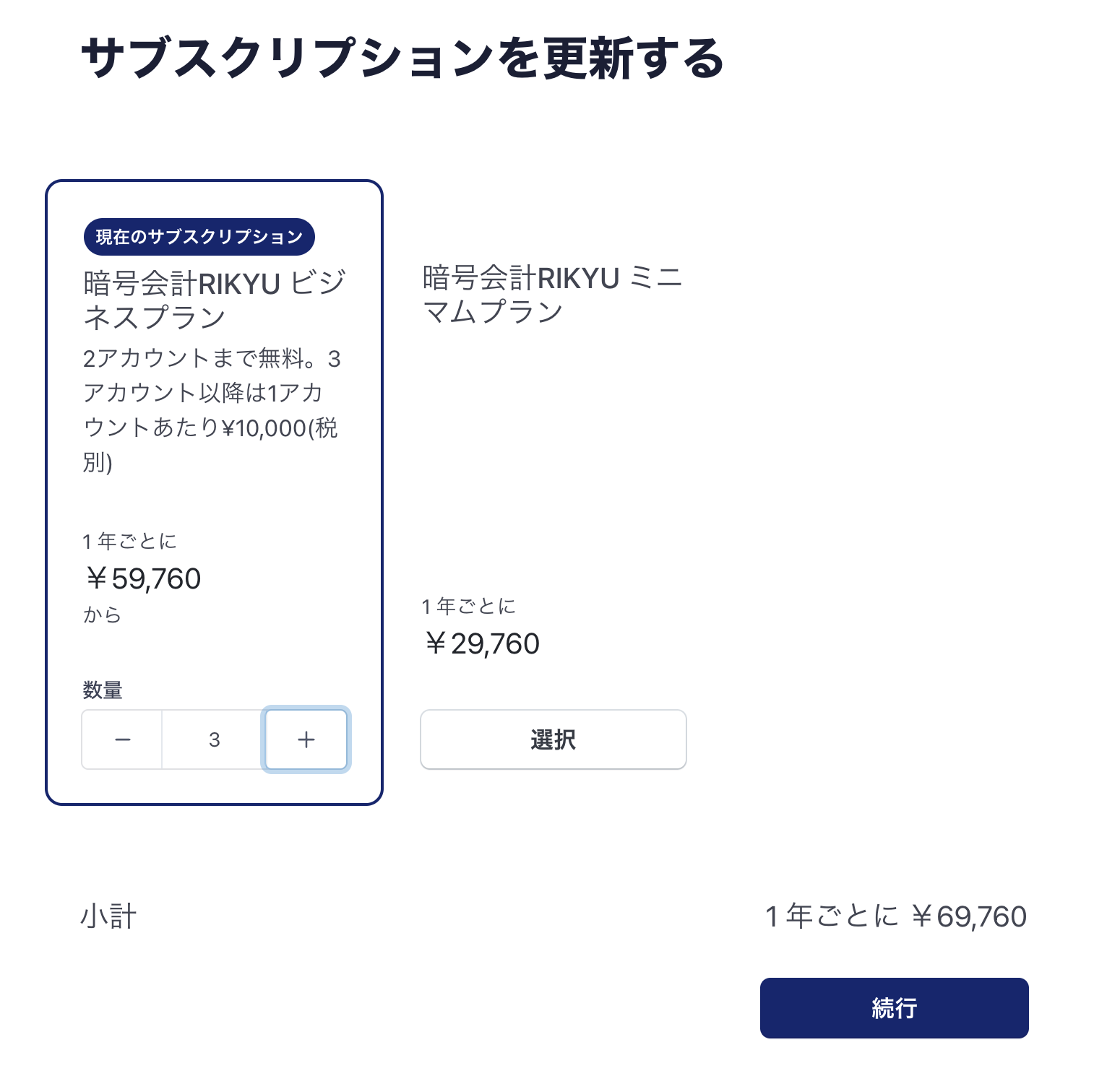 - ご希望の総ユーザー数を指定し、続行をクリックします。 初期値として「2」が選択されていますが、これはプランに含まれる無料ユーザー数です。例えば、合計3名で利用したい場合は、数量を「3」に変更してください(有料追加分は1アカウント)。