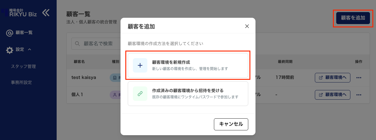 - モーダルで「顧客環境を新規作成」を選択します