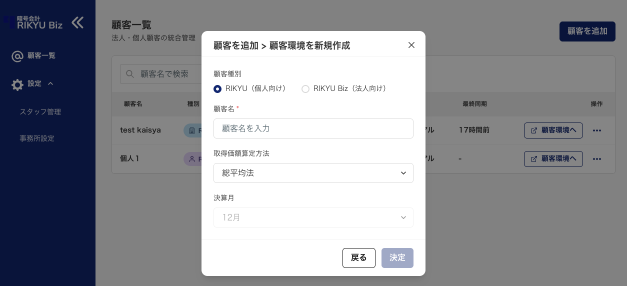 RIKYU(個人向け)または RIKYU Biz(法人向け)を選択します。 - 顧客名/会社名
