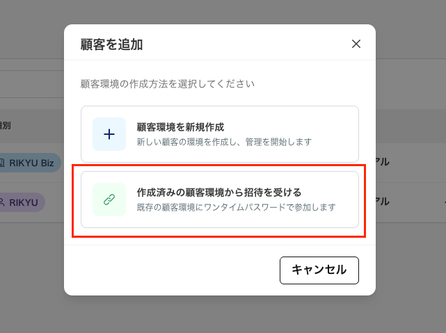 - モーダルで「作成済みの顧客環境から招待を受ける」を選択します