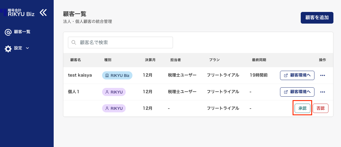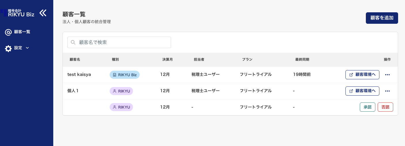 顧客環境へアクセスできる事務所スタッフが表示されます。 - プラン