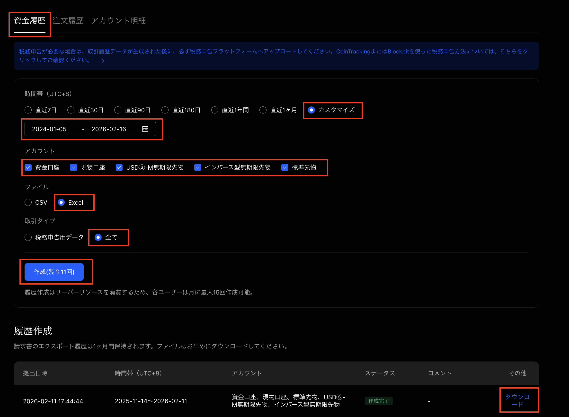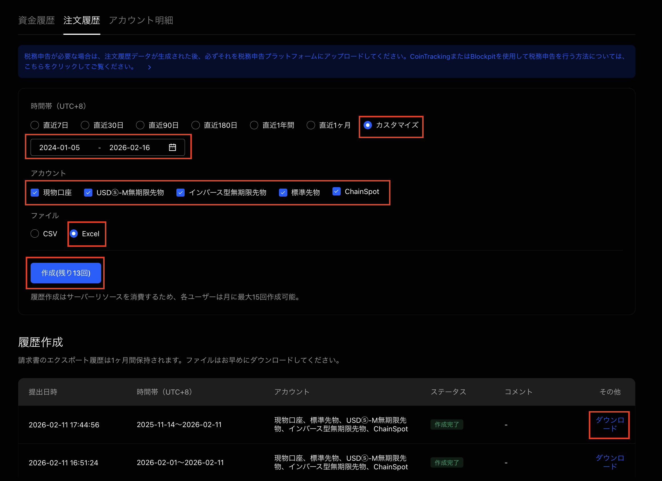 設定後、「作成」をクリックし、作成履歴の一覧でステータスが完了になったら「ダウンロード」をクリックします。ダウンロードしたファイル名の先頭がTransaction_Historyであること、ファイルの拡張子がxlsxであることを確認してください。