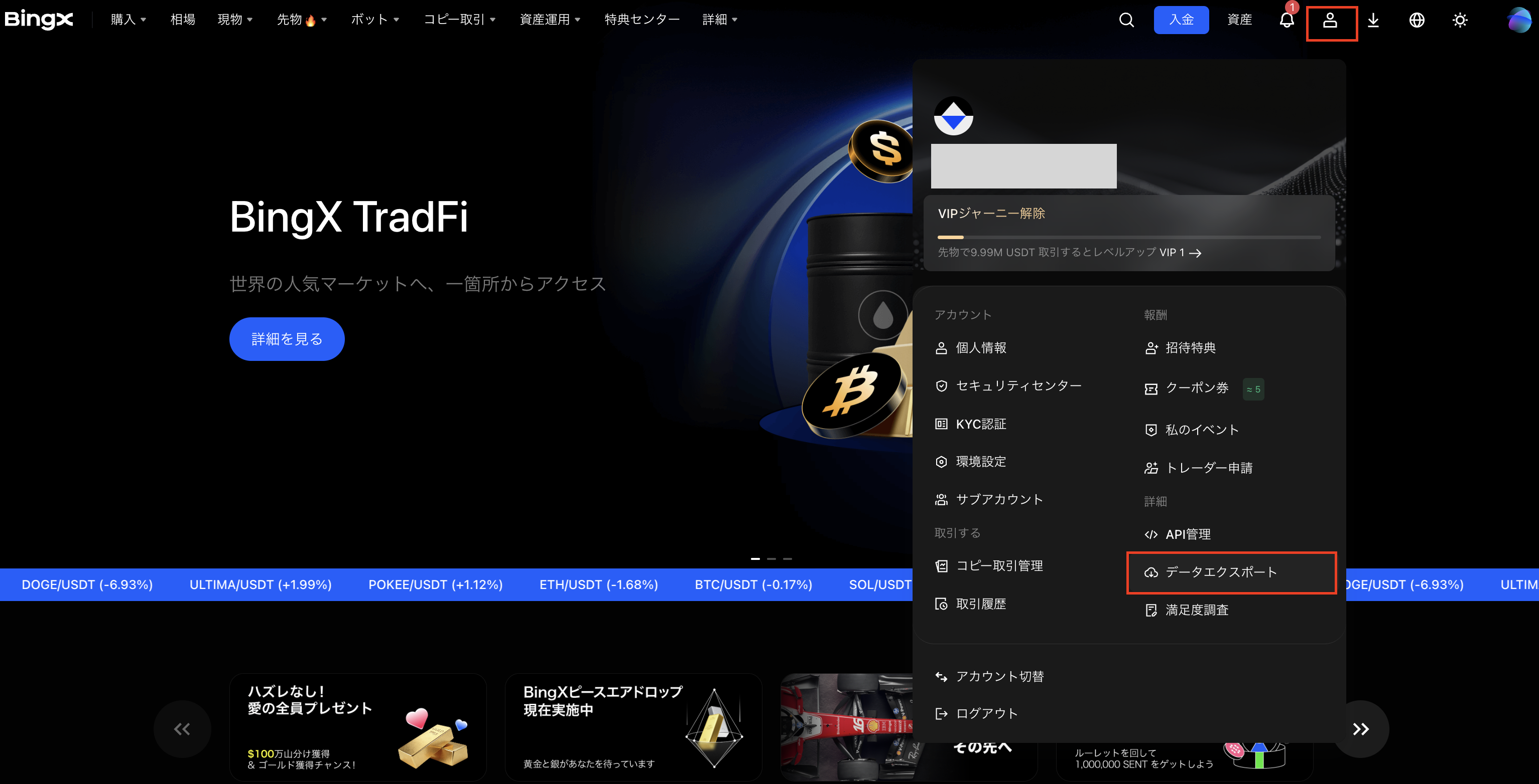 BingXへログイン後、右上のユーザーアイコンから「データエクスポート」を開きます。