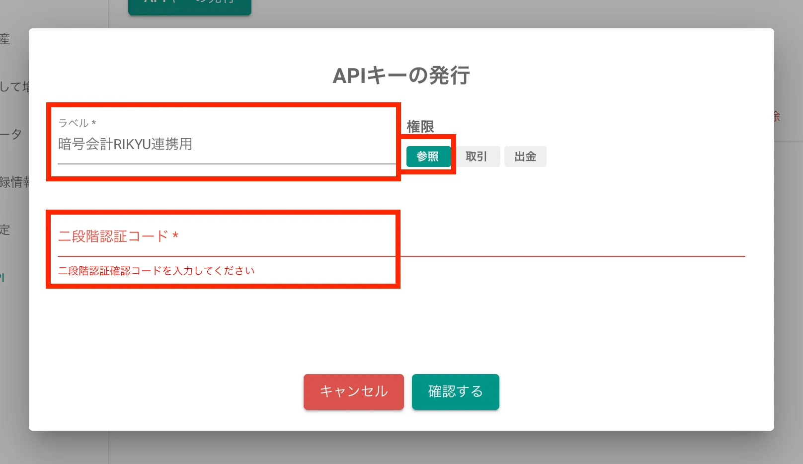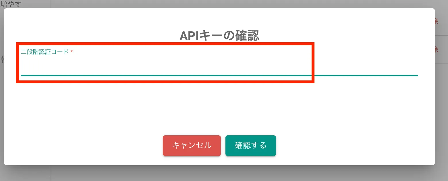 2段階認証コードを入力し、確認をクリックしてください。