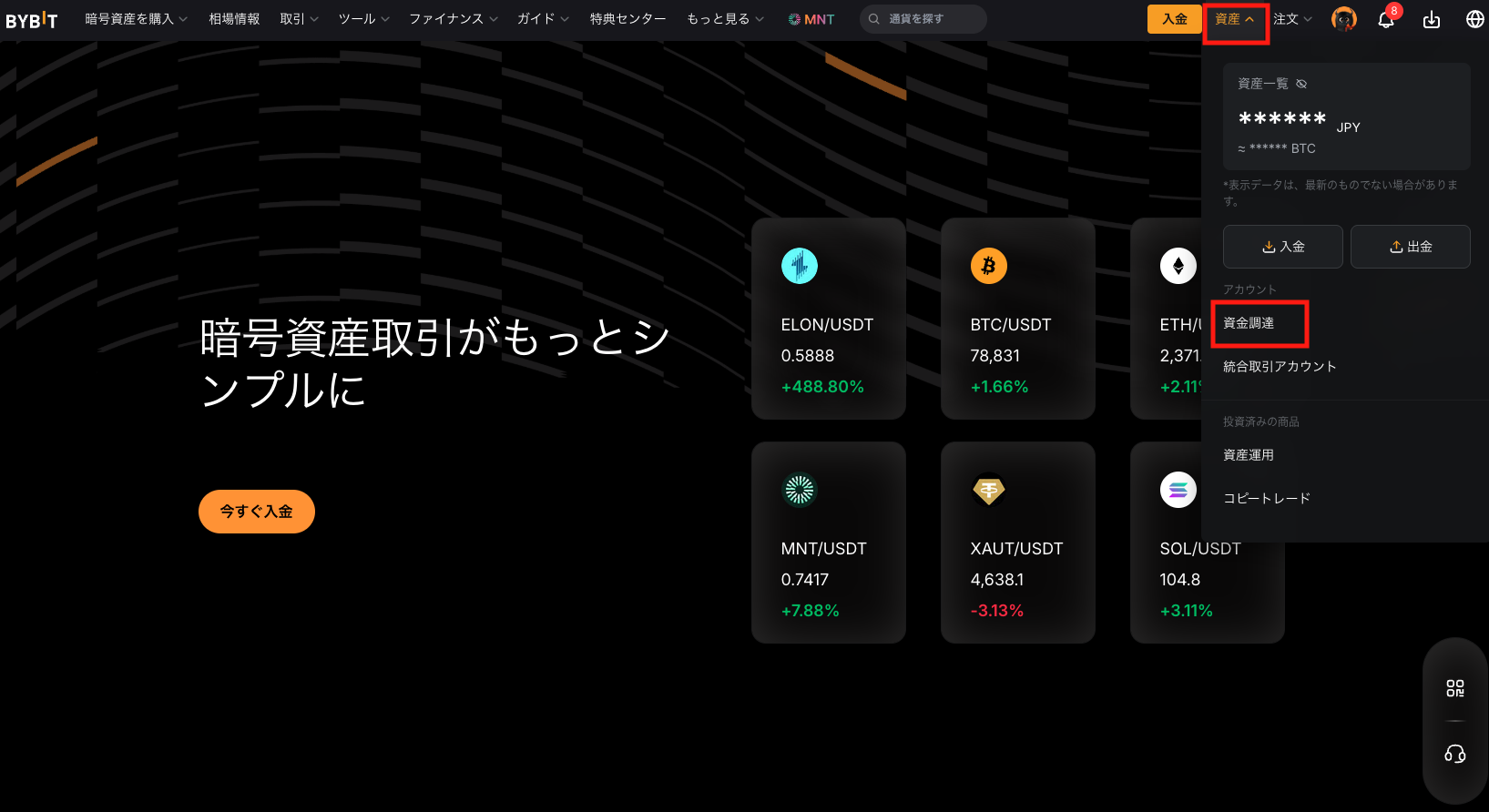 bybitにログイン後、画面右上の資産>資金調達を開きます。