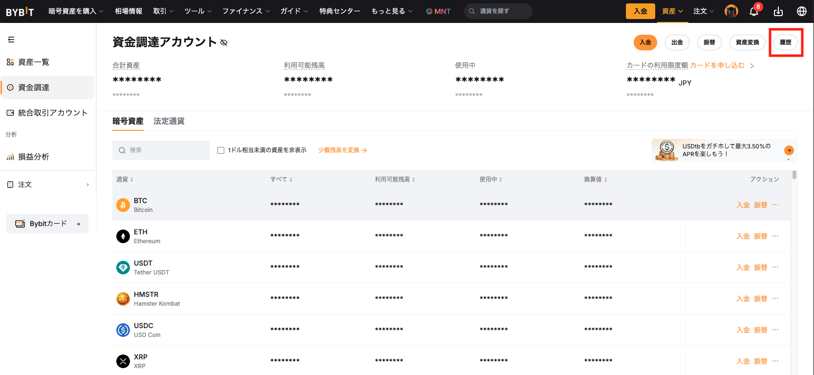 資金調達アカウント画面で、画面右上の履歴をクリックします。