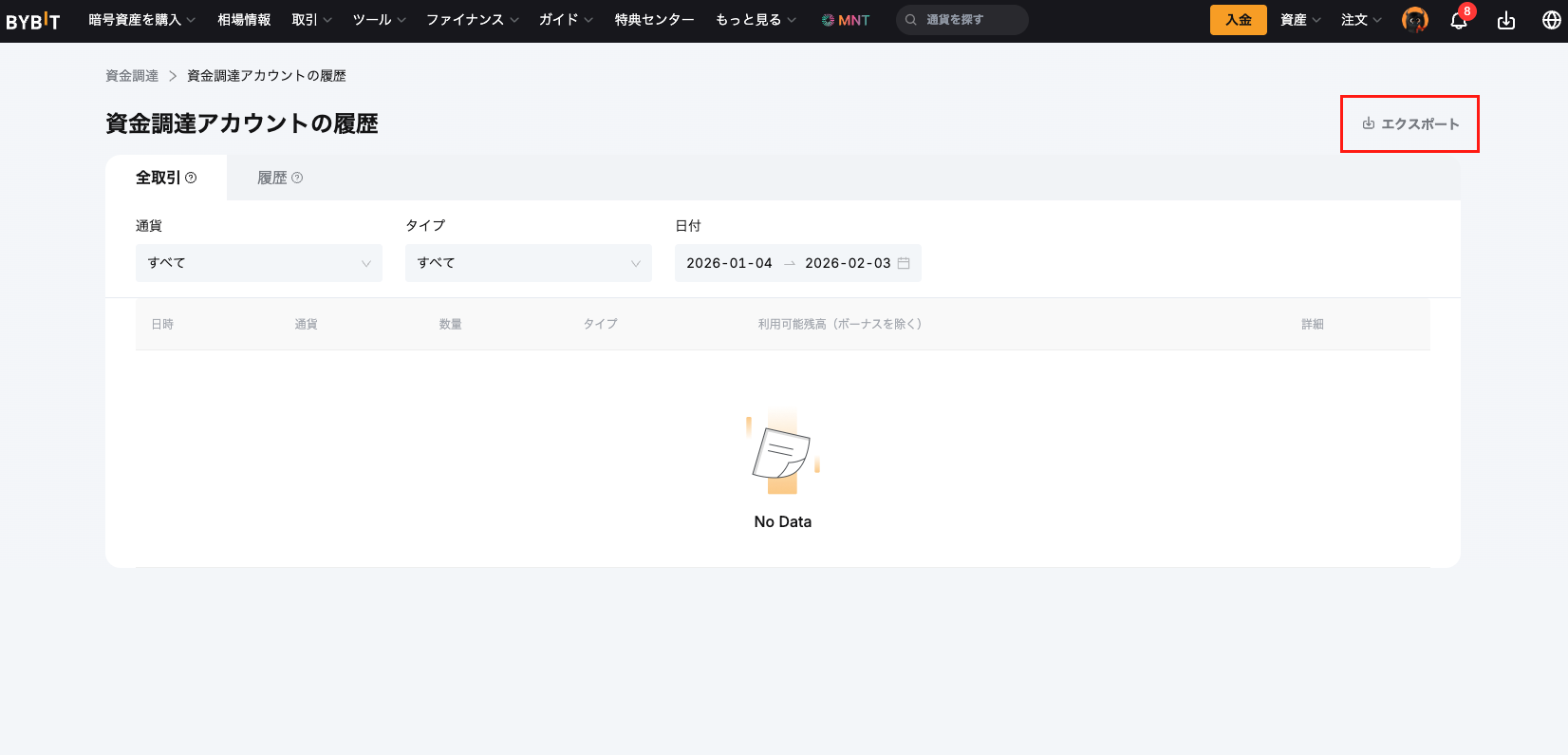 資金調達アカウントの履歴画面でエクスポートをクリック。