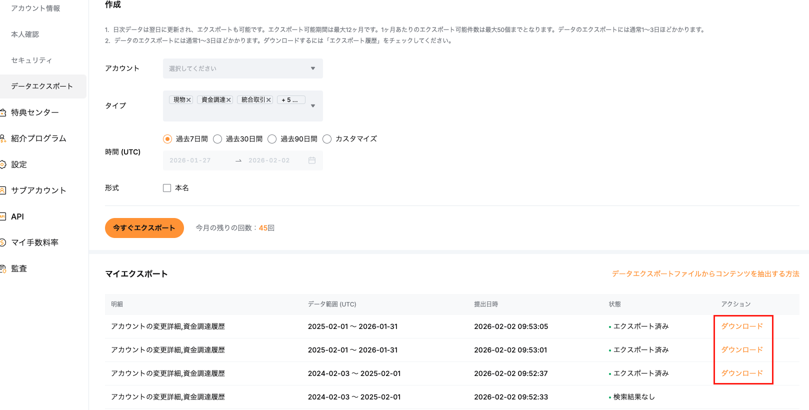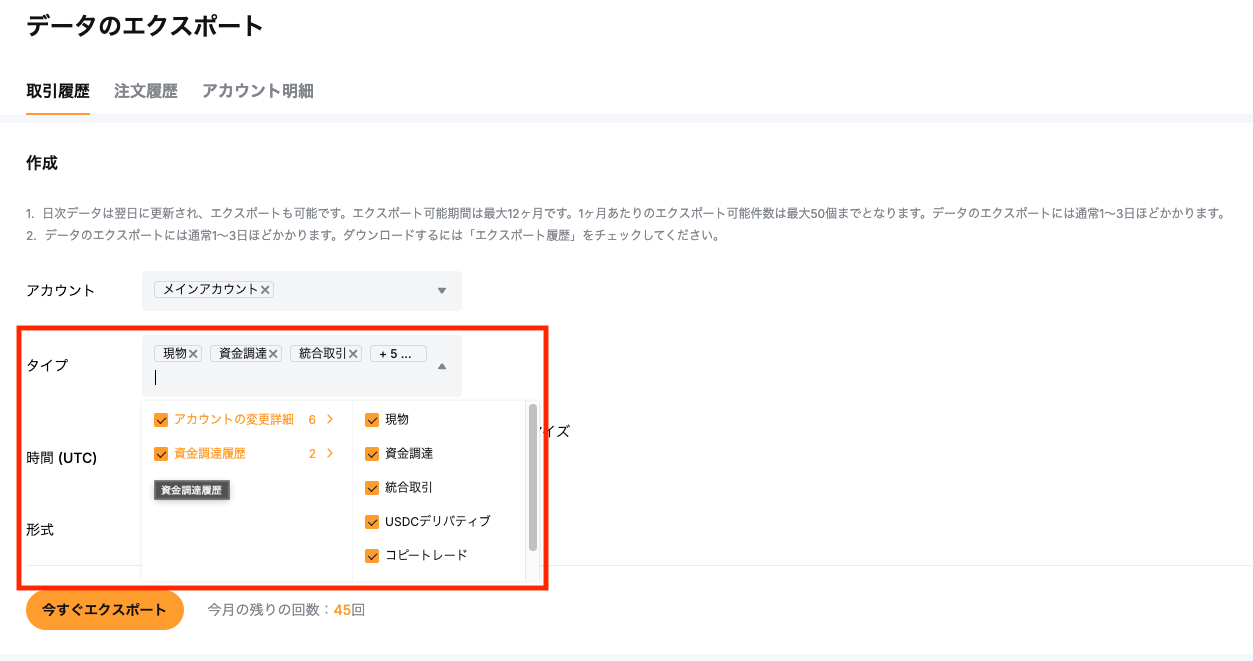 「データのエクスポート」ページで「取引履歴」タブを選択してください。 各項目は下記の通り選択してください。