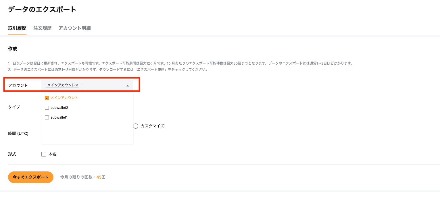 - メインアカウントとサブアカウントは、必ず1つずつ指定して出力してください