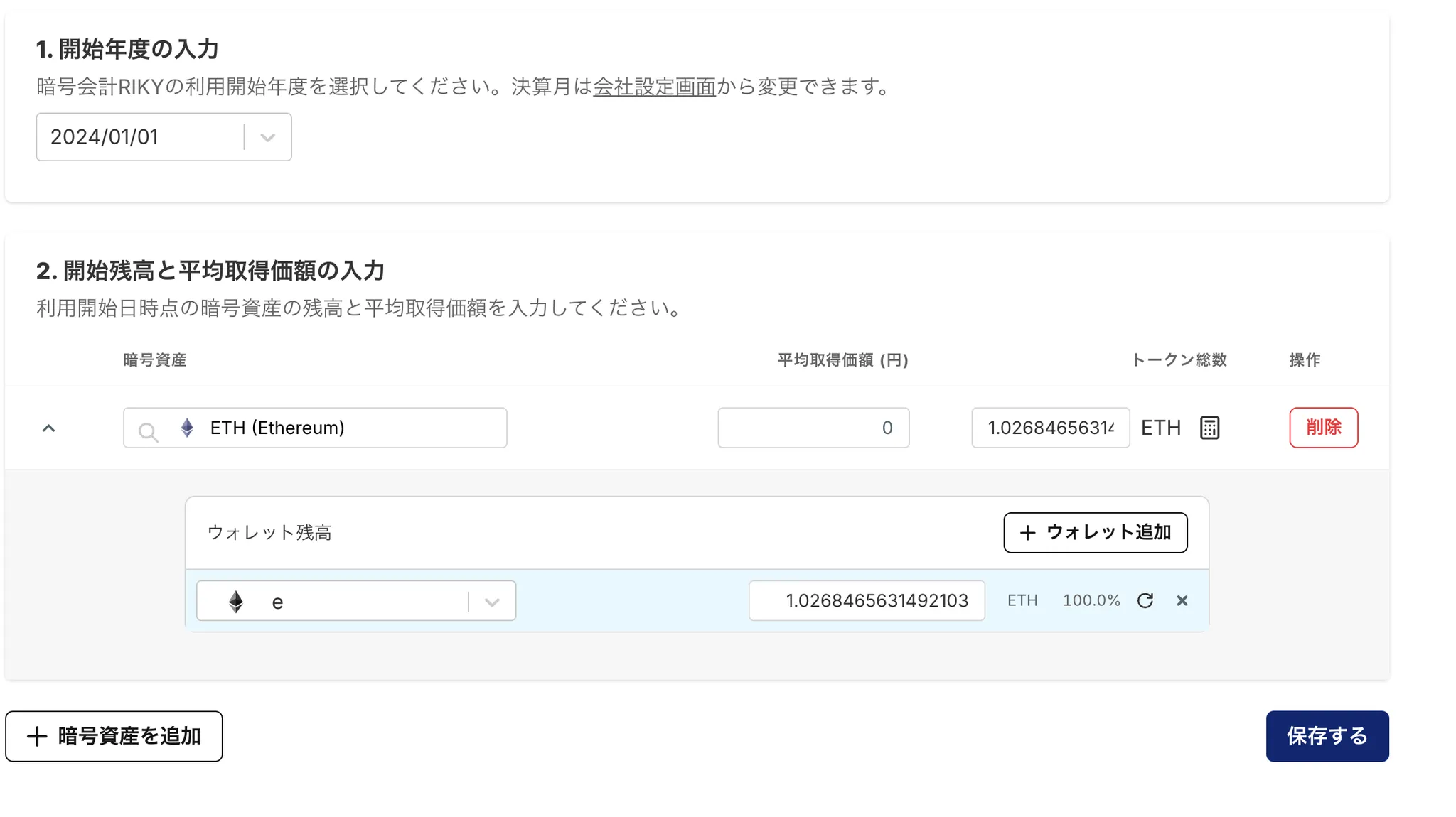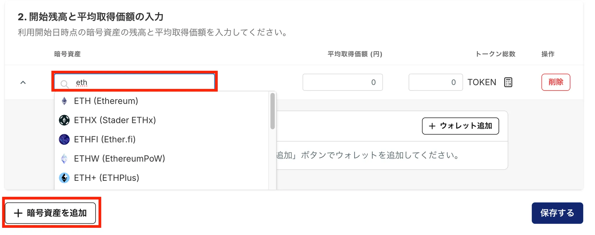 - 登録済みのウォレットに取引履歴がある場合は、電卓アイコンをクリックすることで開始時点の残高を自動計算されます。自動算出後の値を手動で修正することも可能です。
